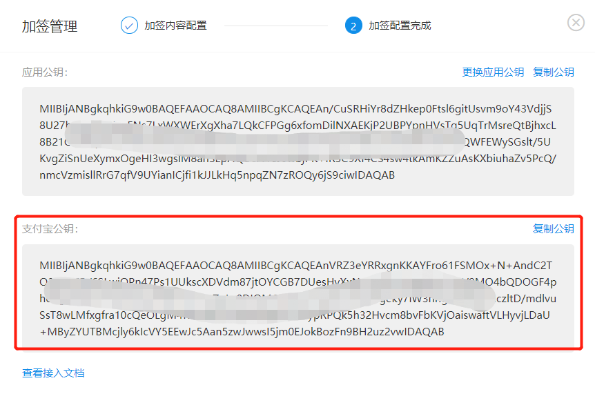 - 复制上图红框中的【支付宝公钥】填入上图(8、登录系统后台配置支付)中的系统后台的【支付应用公钥】