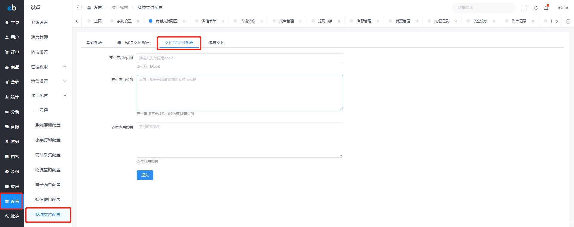 登录CRMEB系统,点击菜单设置→接口配置→商城支付配置→支付宝支付配置