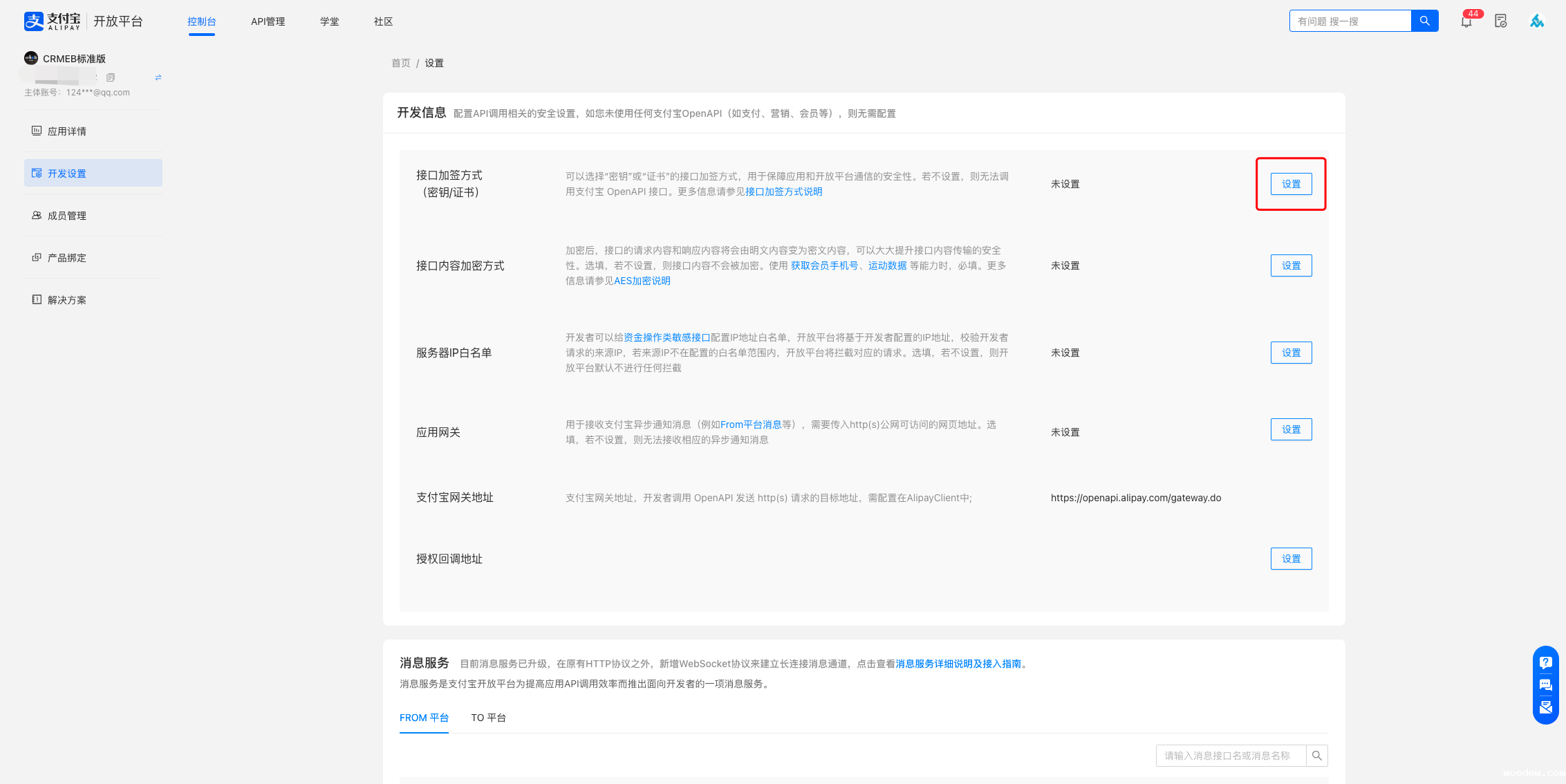 3、创建好应用后进去配置阶段,点击下图中的设置,进入接口加密设置,这里需要验证短信