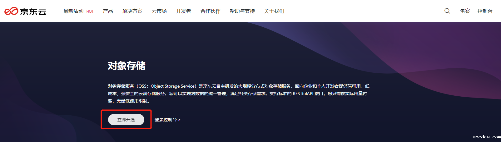 1、登录京东云官网,进入对象存储必威betwayApp下载页,点击立即开通: