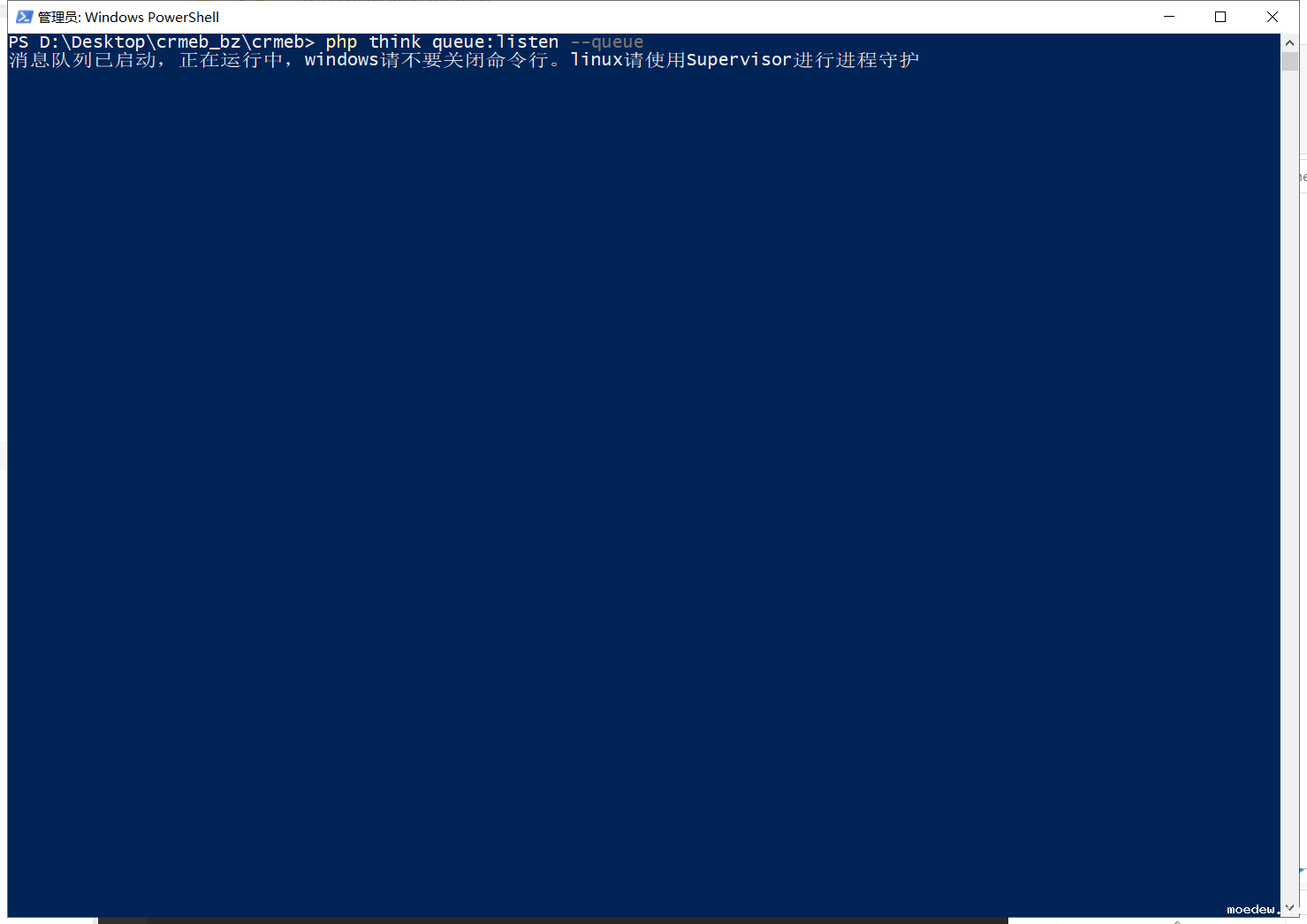 输入命令:php think queue:listen --queue 显示以下内容即为启动成功