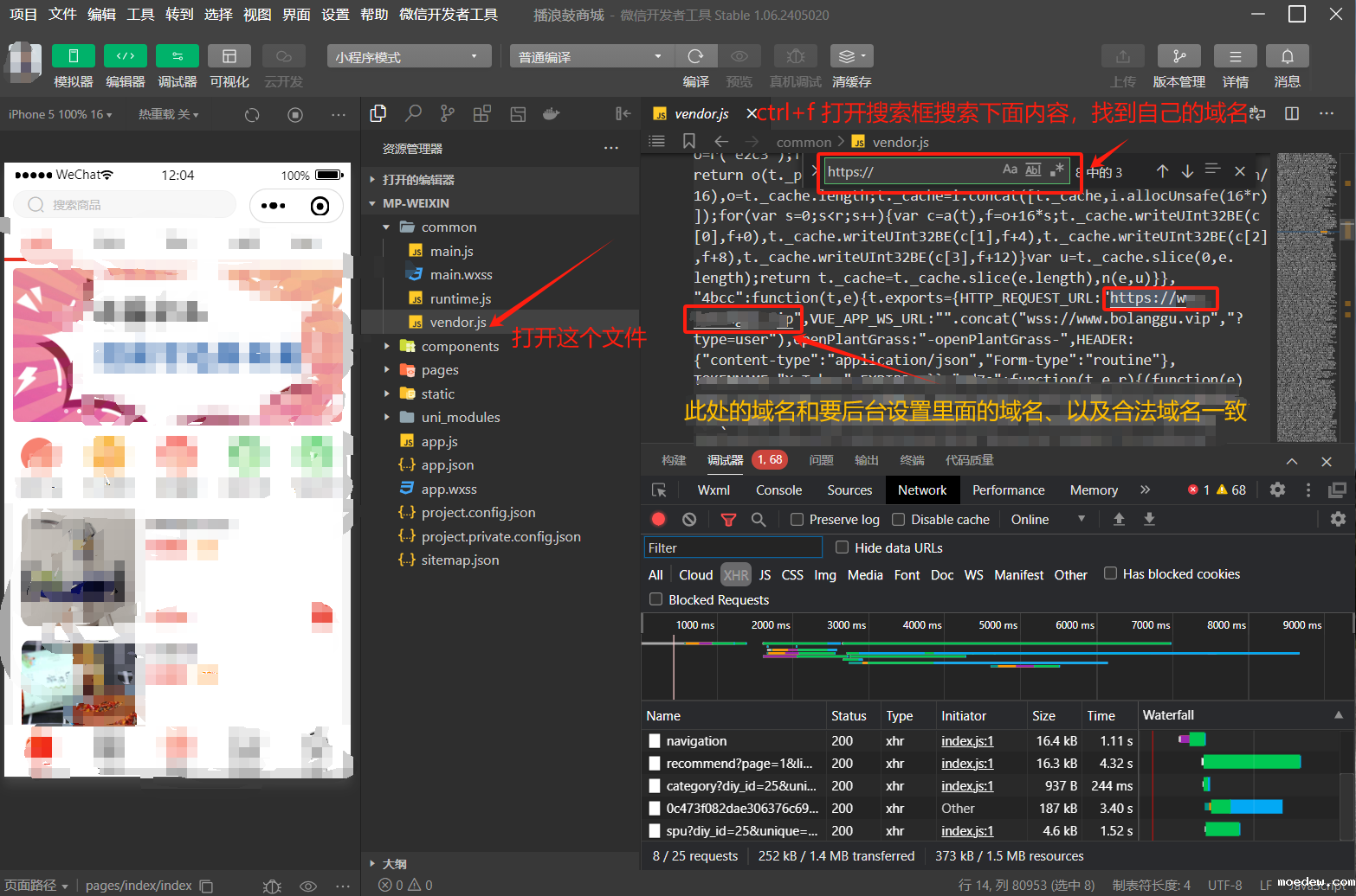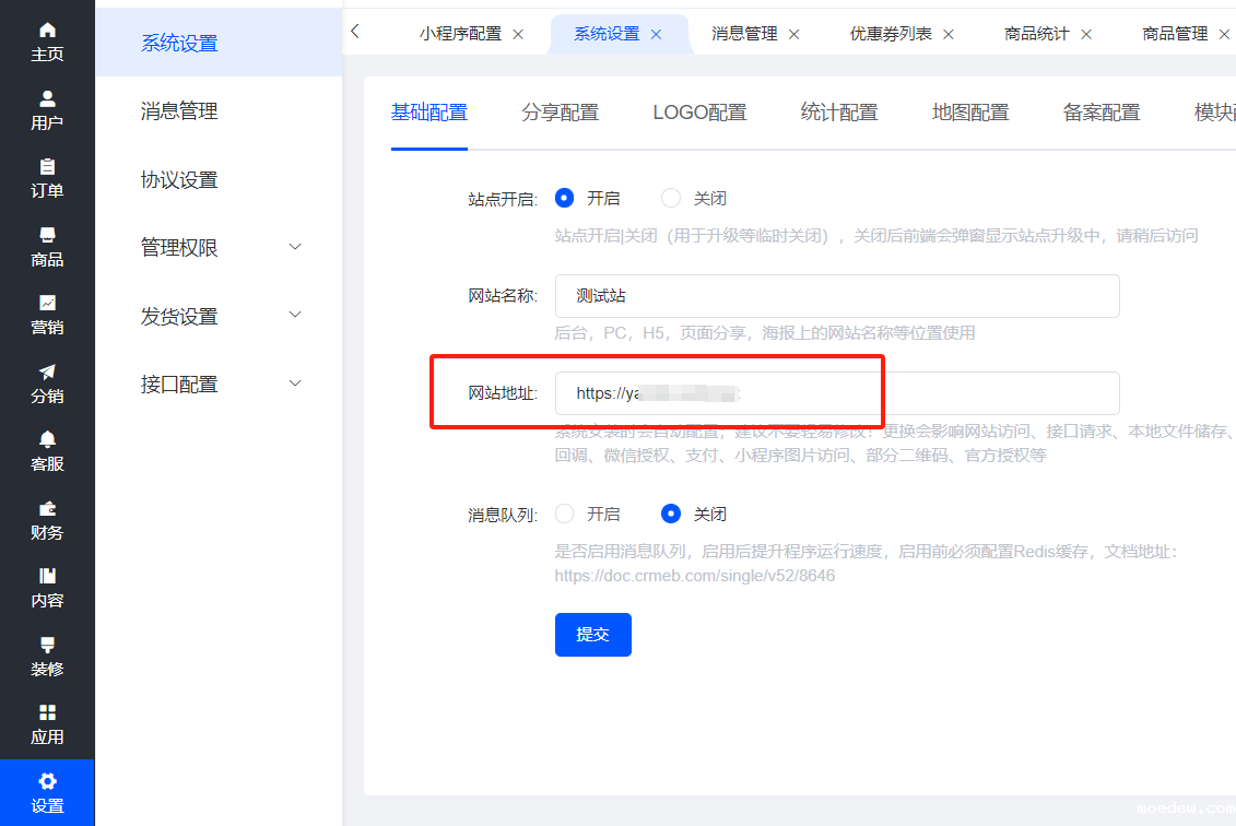 你小程序使用的域名为:www.moedew.com ,但你配置的合法域名是: crmeb.com 这是不行的