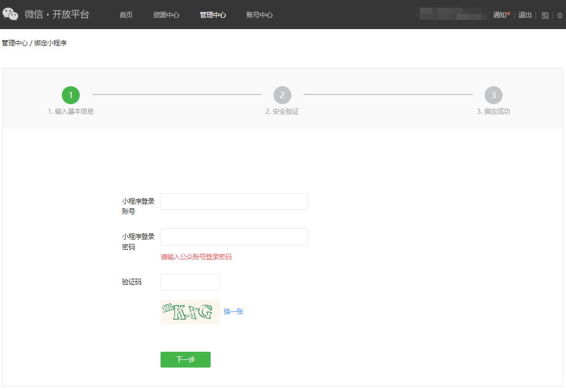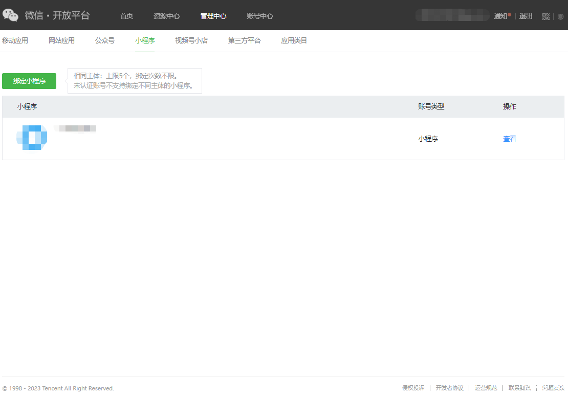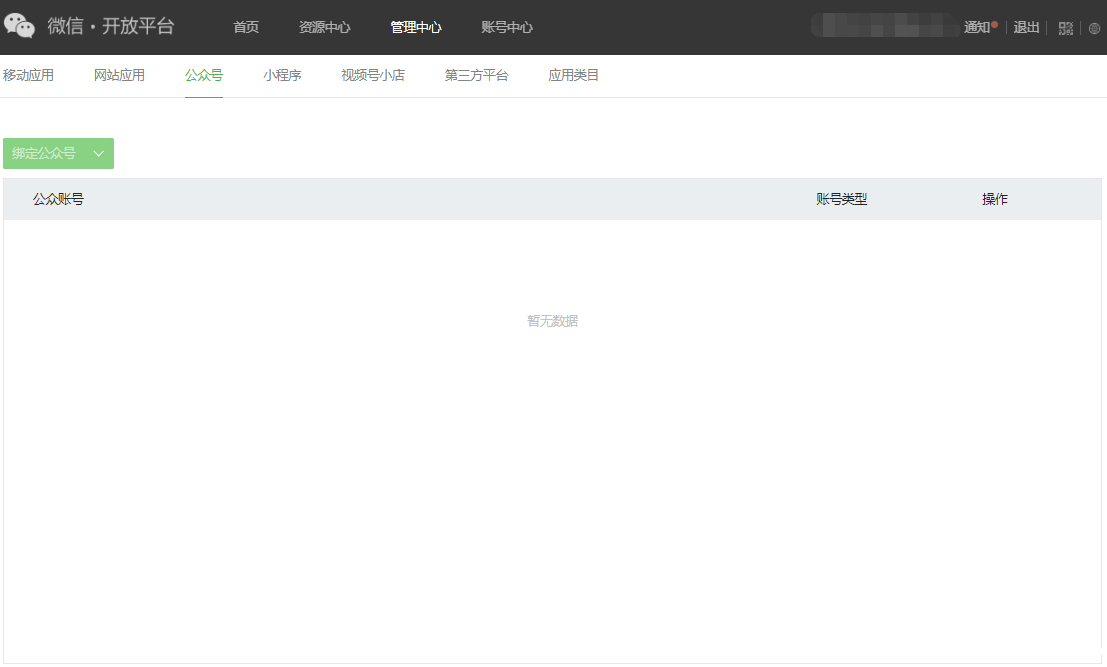 1、登录微信开放平台:https://open.weixin.qq.com ->【管理中心】->【公众号/小程序】->【绑定公众号/小程序】;