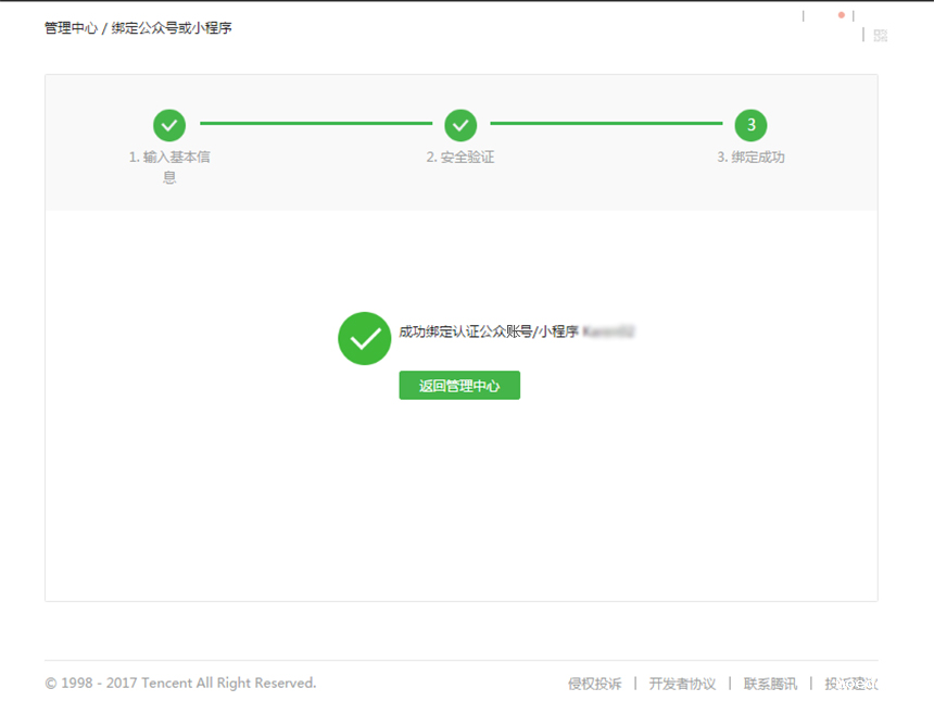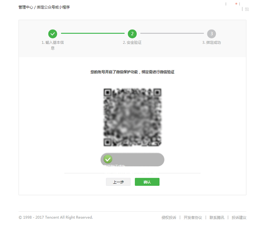 3、使用公众号管理员微信号进行扫码验证,验证通过后,即绑定成功。