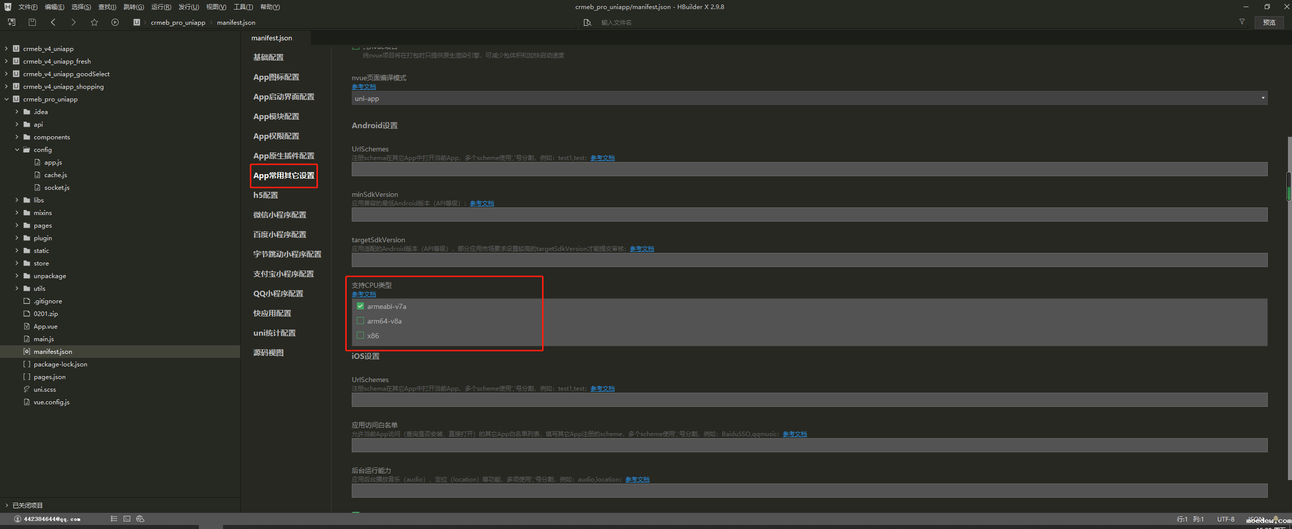 5.点击《App常用其他配置》,勾选《支持CPU类型》下的armeabi-v7a