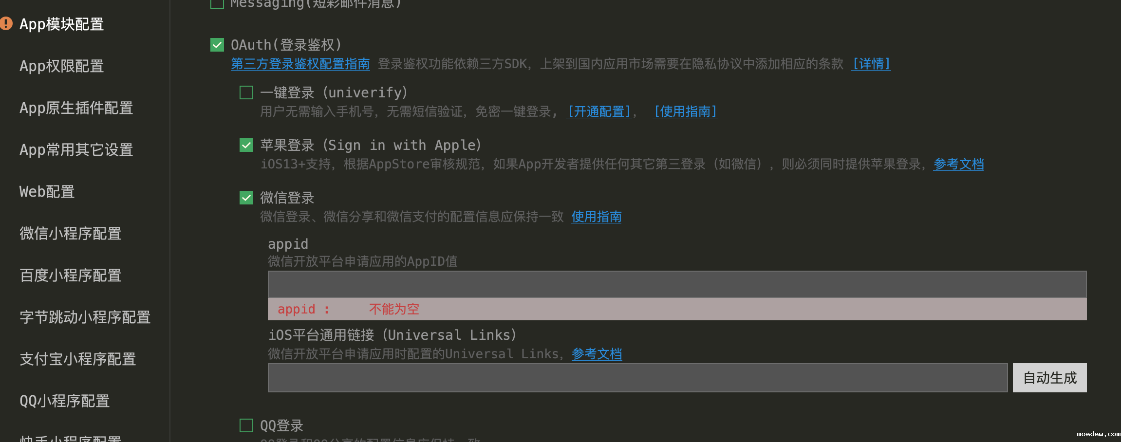 3-1. 选择《OAuth(登录授权)》,选择《微信登录》,填写开放平台的 appid 以及 Universal Links