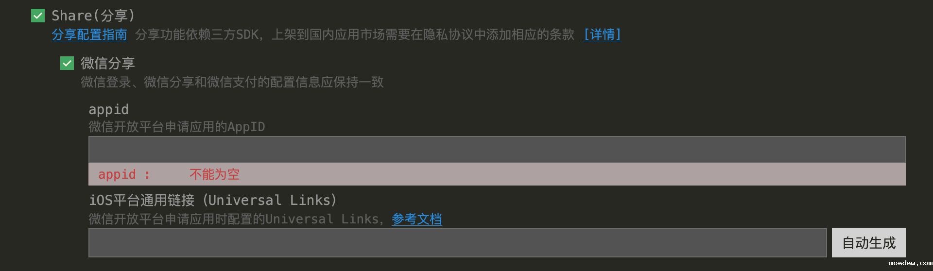 微信所有的相关配置需要appid和需要生成ios平台通用链接