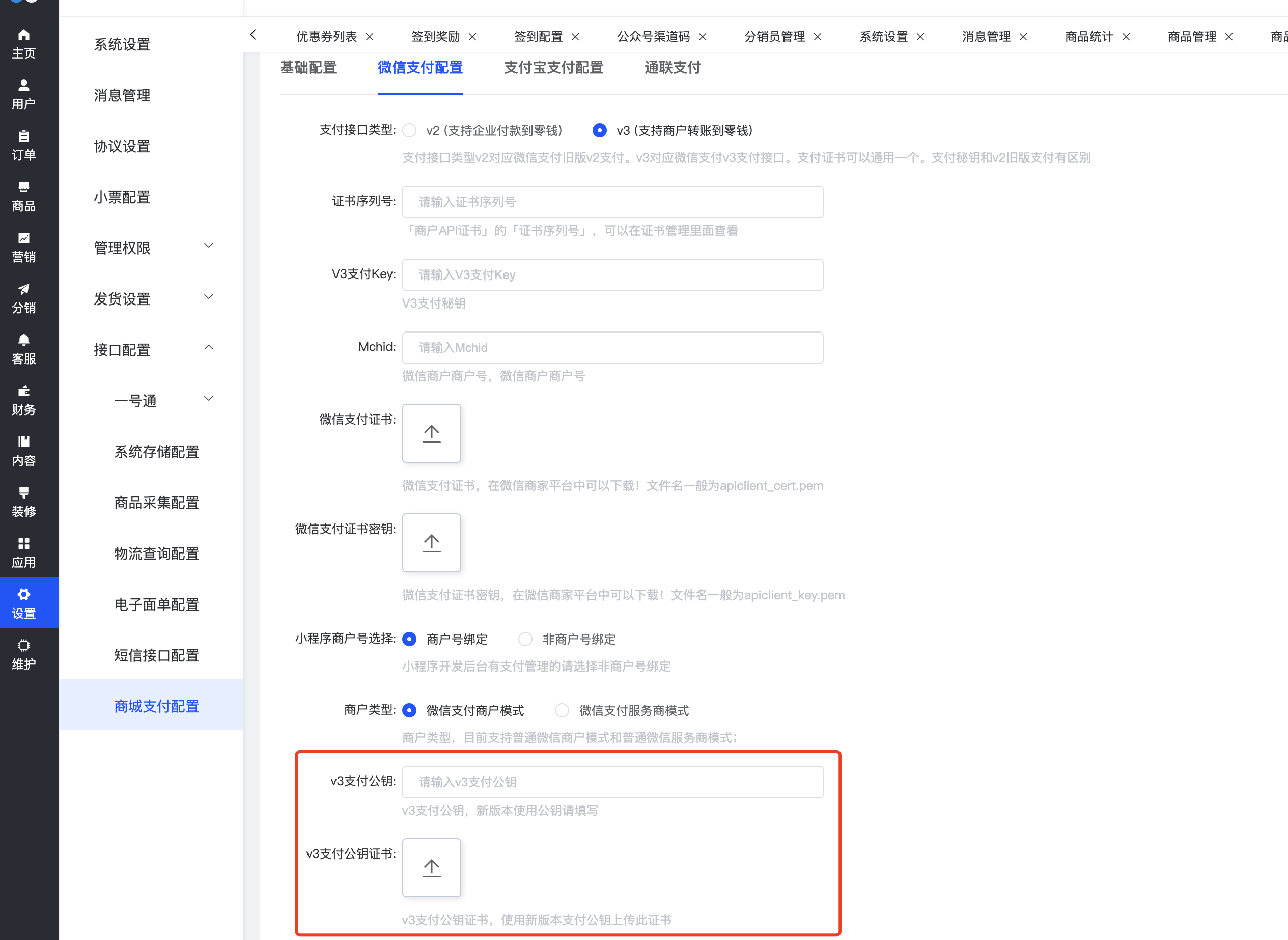INSERT INTO `eb_system_config` (`id`, `menu_name`, `type`, `input_type`, `config_tab_id`, `parameter`, `upload_type`, `required`, `width`, `high`, `value`, `info`, `desc`, `sort`, `status`, `level`, `link_id`, `link_value`) VALUES (null, 'v3_pay_public_pem', 'upload', 'input', 4, '', 3, '', 0, 0, '\"\"', 'v3支付公钥证书', 'v3支付公钥证书,使用新版本支付公钥上传此证书', 0, 1, 0, 0, 0);