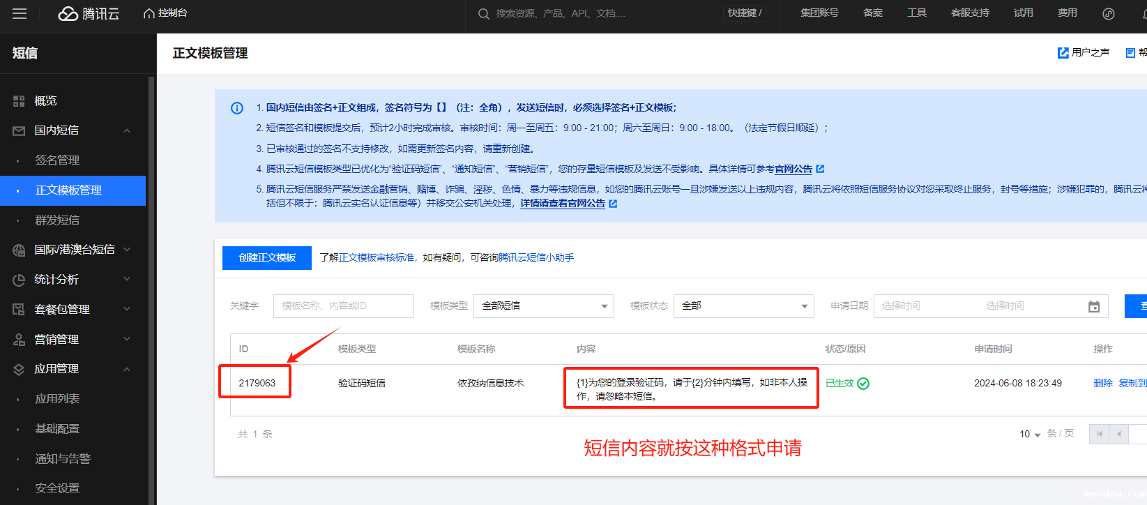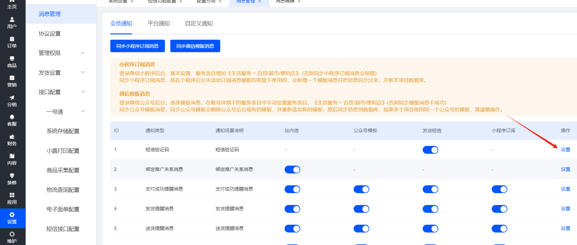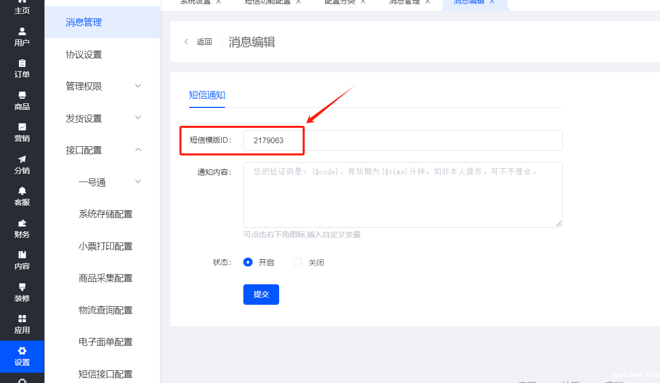 最后将腾讯云的短信模板id填到商城后台的消息管理的模板里面