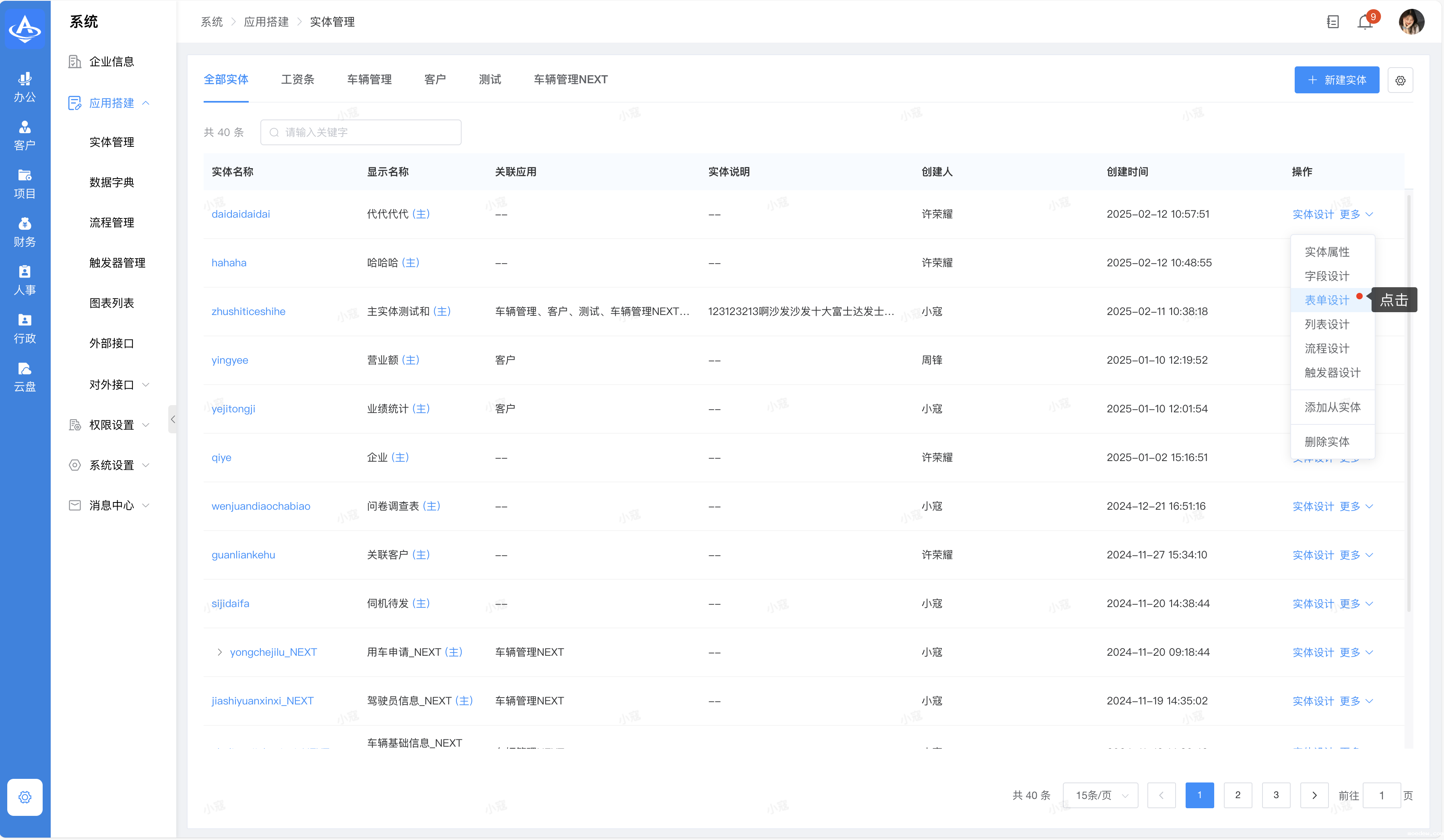 功能页面操作路径:系统设置>应用搭建>实体管理