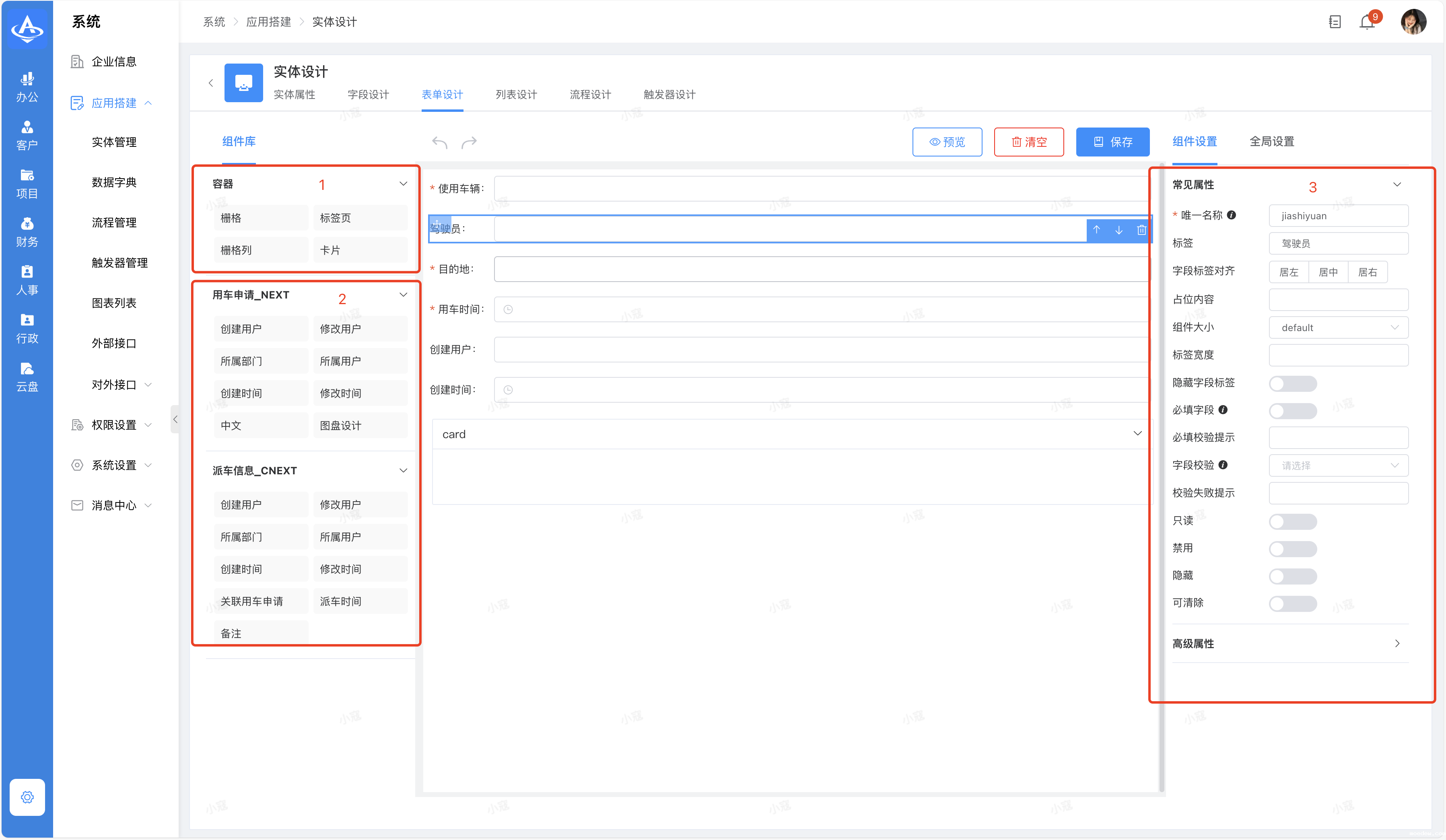 功能说明:表单设计页面分为三个区域,分别是容器区,字段区,组件设置区,通过这些区域的结合使用,能够在表单设计页面上轻松创建、布局和设置自定义表单。容器区用于划分表单布局的不同部分,组件设置区则提供了配置每个组件的灵活性,而字段选择区则可以更加方便的添加和选择所需的字段。