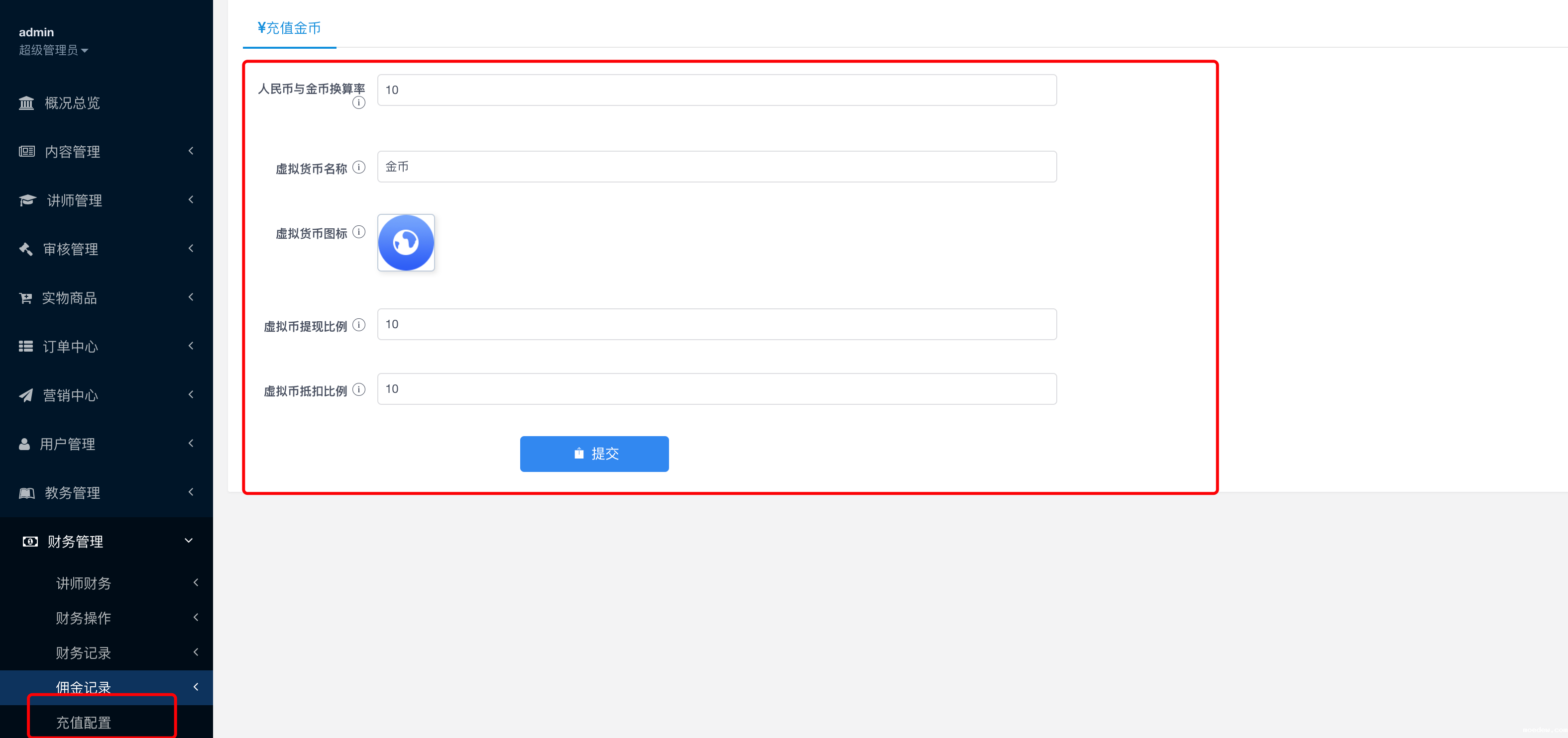 充值人民币和金币的换算概率,默认:1元人民币=10系统虚拟金币
